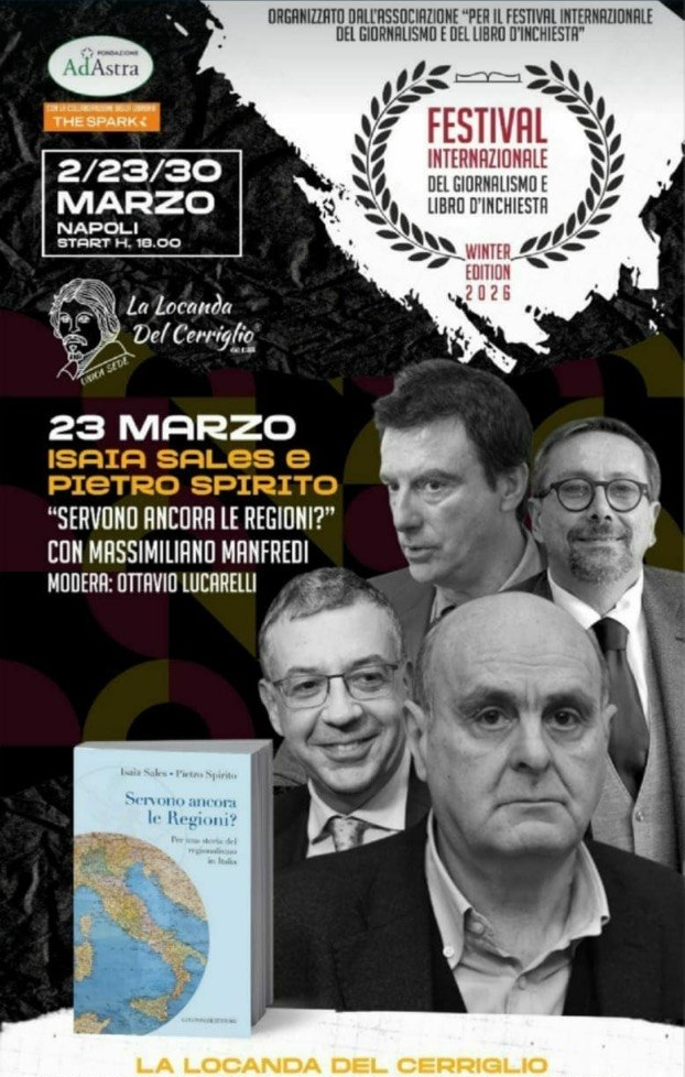 Il 23 Marzo 2026 La Locanda del Cerriglio ospita Isaia Sales e Pietro Spirito, autori di “Servono ancora le regioni?”, moderatore Ottavio Lucarelli, parteciperà all’evento Massimiliano Manfredi